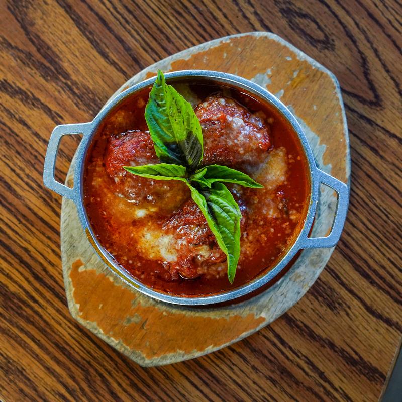 Lightly fried panko bread stuffed with smoked mozzarella, with a side of tomato sauce.