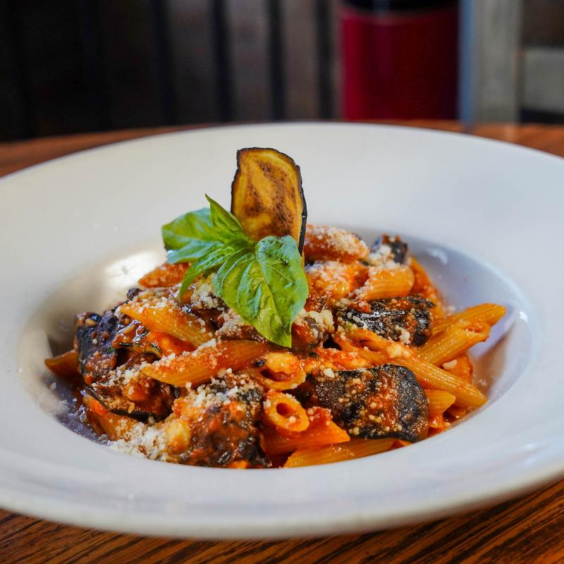 Penne pasta, tomato sauce, eggplant, homemade mozzarella, and Parmigiano Reggiano.