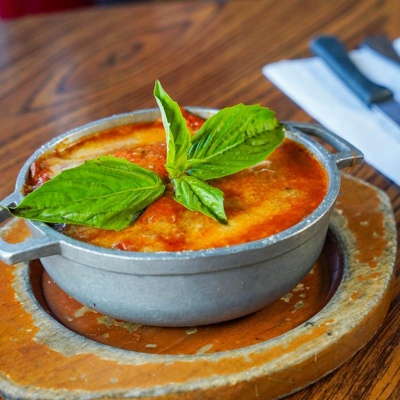 Layers of eggplant in tomato sauce with homemade mozzarella and Parmigiano Reggiano.