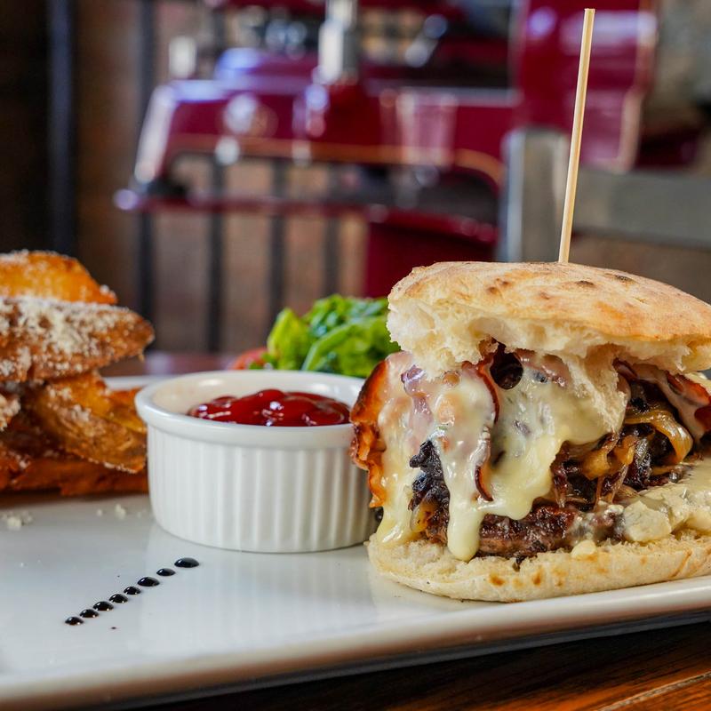 Piemonte beef, quadrelo di bufala, carmelized onion, radicchio, smoked bacon, potato wedges, pizza bun.