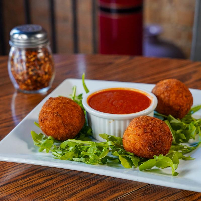 Rice balls stuffed with spicy salami and homemade mozzarella.