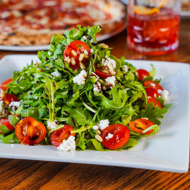 Baby arugula with cherry tomatoes, pine nuts, and goat cheese.