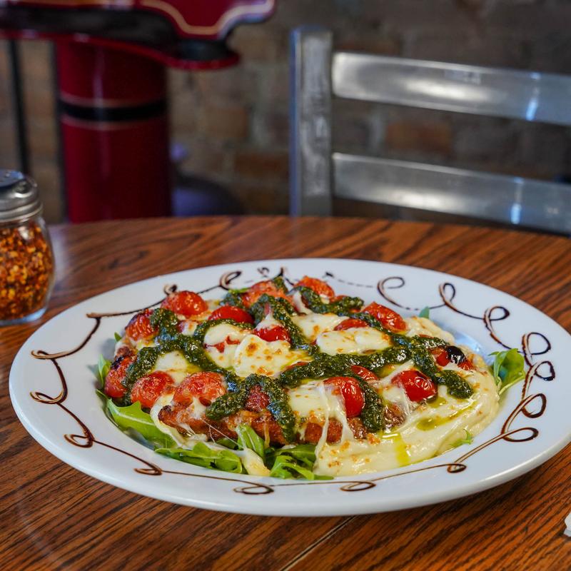 Chicken cutlet, homemade mozzarella, baby arugula, cherry tomatoes, Parmigiano Reggiano, pesto sauce, and a balsamic glaze.